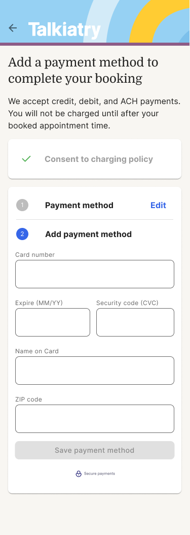 Note: For patients receiving care in Connecticut, you will also be asked to consent for Talkiatry to automatically charge for missed appointments and medical services before adding a payment method on file.
